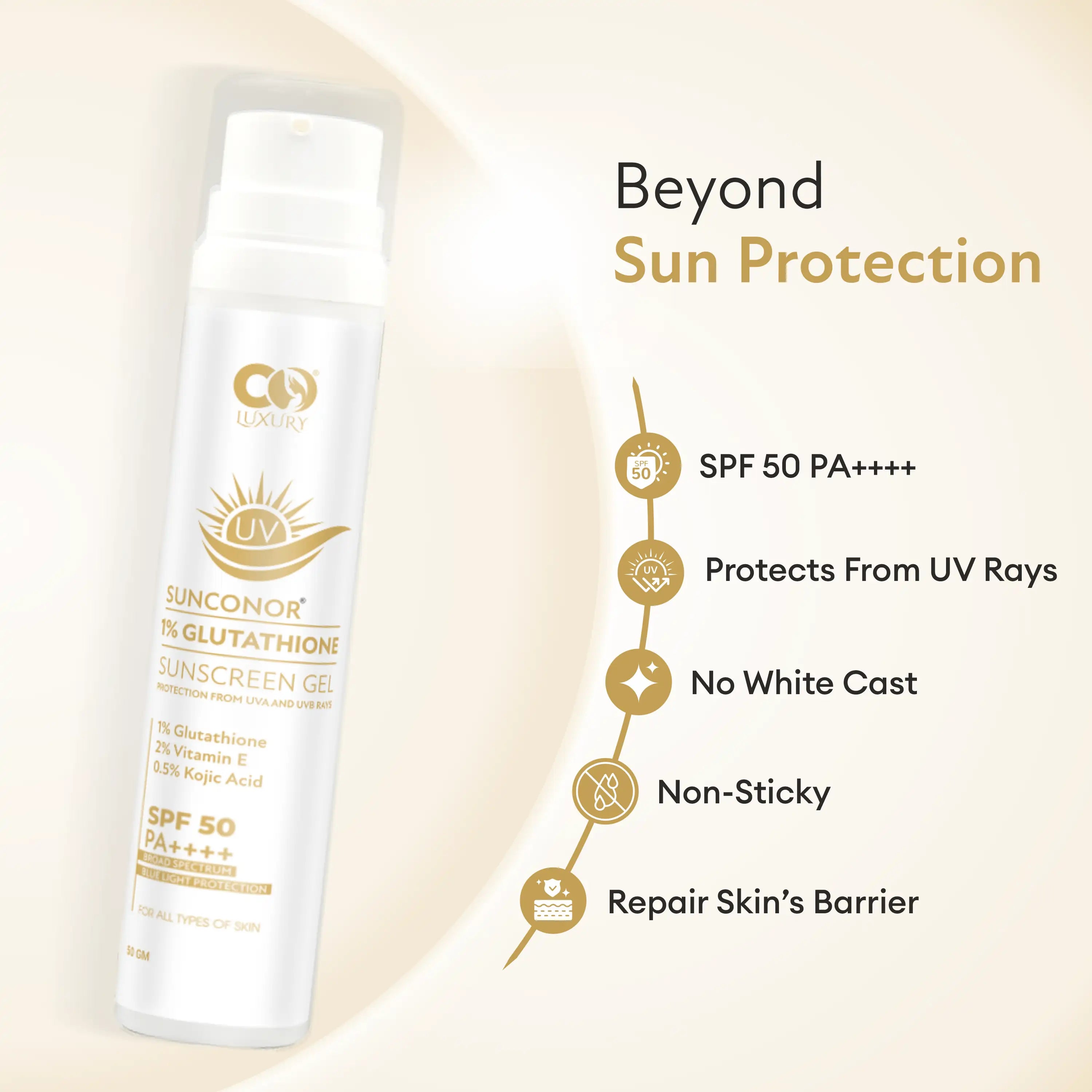 Elevate your sun care regimen with CO LUXURY Glutathione Sunscreen Gel and indulge in the luxury of superior protection and radiant, healthy-looking skin.